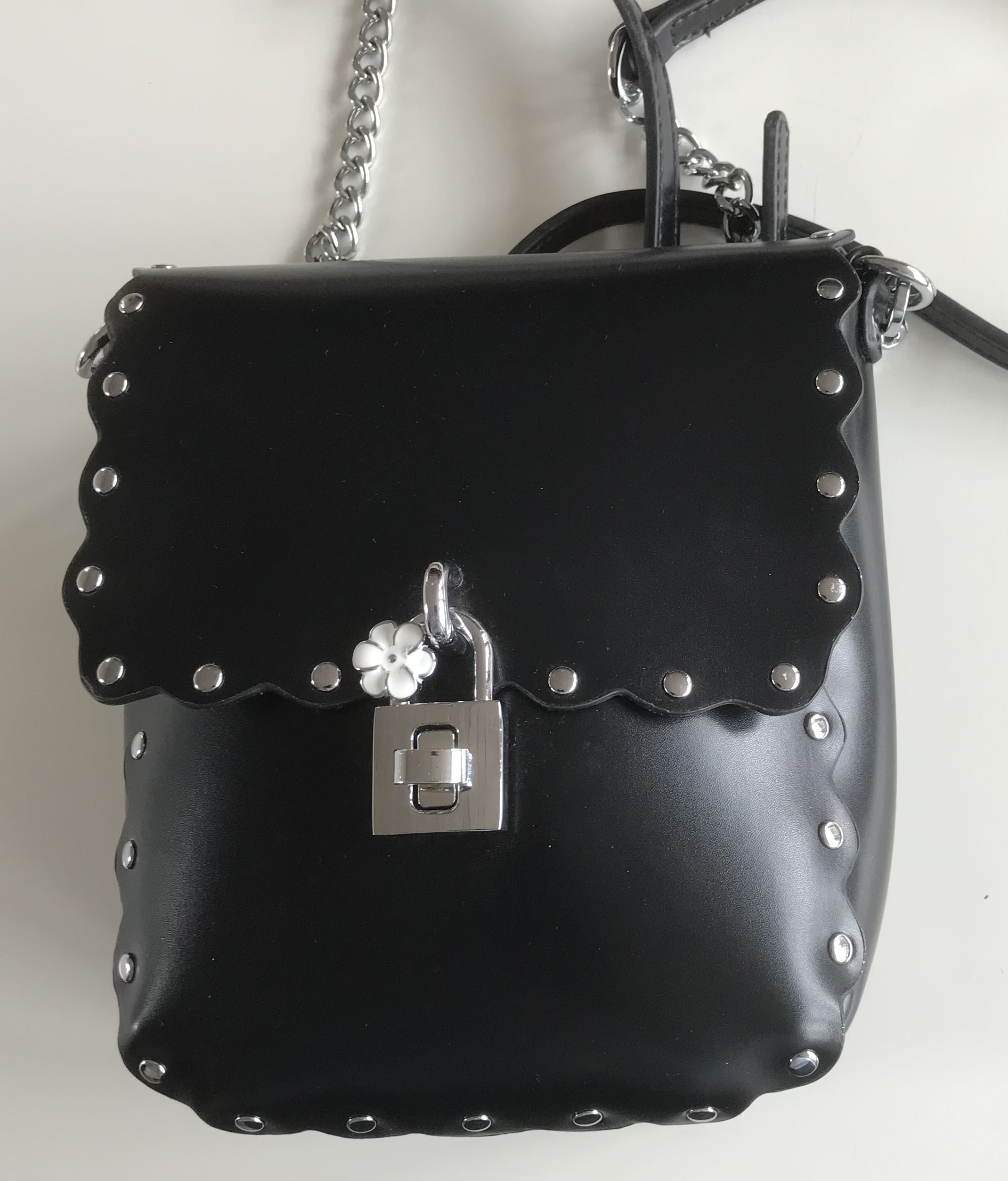 Sort skuldertaske med nitter som pynt. Lukning med lille lås som pynt. Lang rem samt kort rem.
